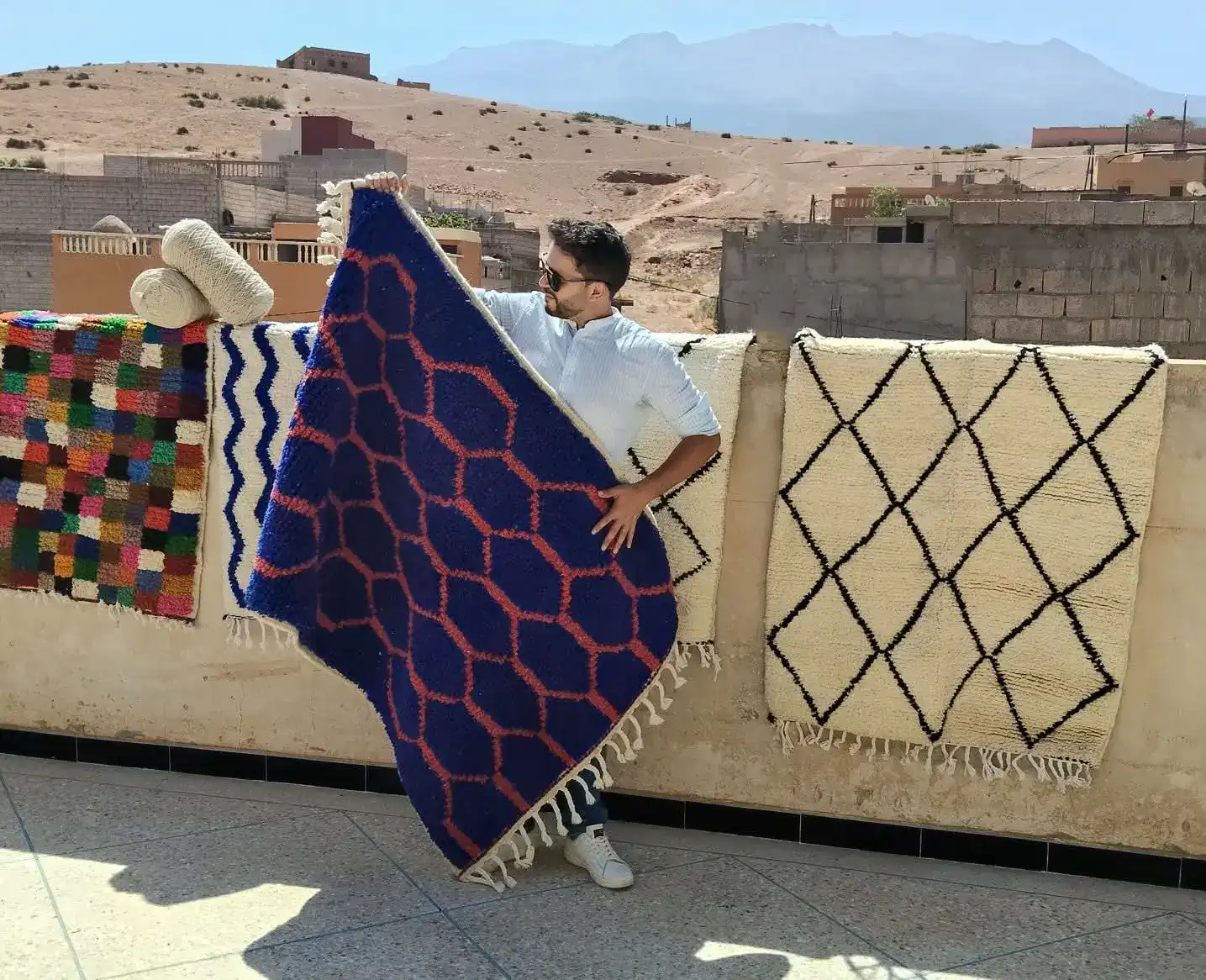 Veel ontwerpen maak ik zelf – van kleur tot materiaal. Ze worden met de hand geweven door vrouwen uit het Atlasgebergte. Ook bied ik hun eigen authentieke ontwerpen aan. Bij Zarábia vind je vier stijlen: Bohemien, Modern, Beni Ouarain en Vintage/Retro – elk met karakter en ziel.